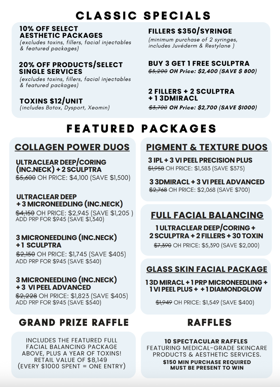 FILLER, SCLUPTRA, LASER TREATMENTS, MICRONEEDLING, VI PEEL, PRP SERVICES, DIAMONDGLOW, HYDRAFACIAL, 5-STEP FACIAL